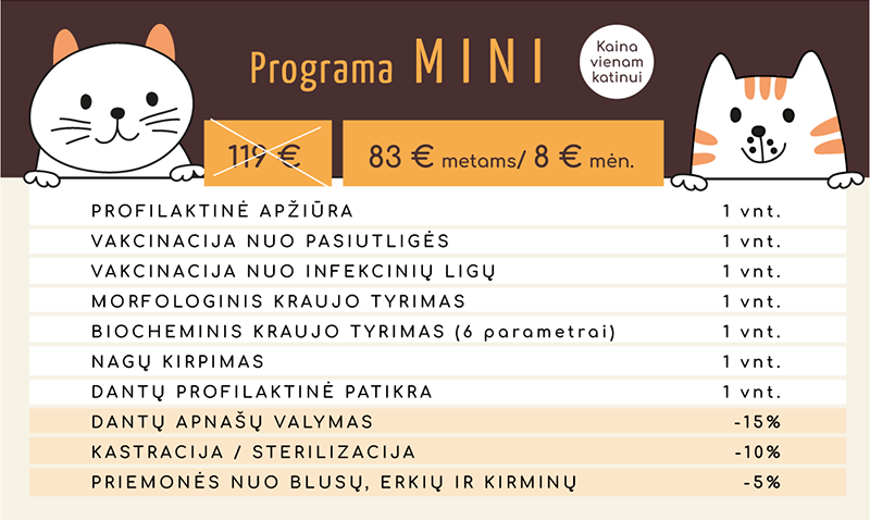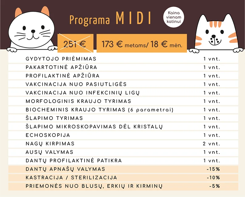 Paslaugų programos skirtos šunims ir katėms. Pagal įtrauktų paslaugų apimtį galite pasirinkti MINI, MIDI, MAXI programą, nepriklausomai nuo gyvūno amžiaus,  atsižvelgiant į jo sveikatos būklę ir poreikius.